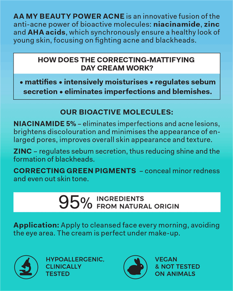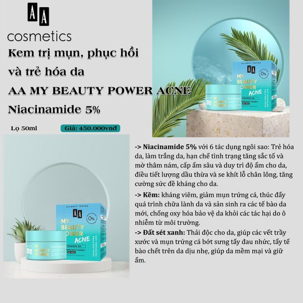 Kem mụn, mờ thâm, kiềm dầu AA COSMETICS MY Beauty Power Acne Correcting and Mattifying Day Cream Niacinamdie 5% là sự kết hợp sáng tạo và hoàn hảo giữa sức mạnh chống mụn của các phân tử hoạt tính sinh học: Niacinamide, Zinc và các acid AHA, giúp chăm sóc toàn diện cho làn da khỏe mạnh và tươi trẻ, tập trung vào việc ngăn chặn mụn trứng cá và mụn đầu đen.