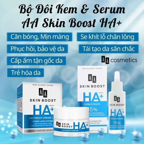Bộ Combo cấp ẩm và căng mịn da da AA COSMETICS Skin Boost HA+ bao gồm 2 sản phẩm: