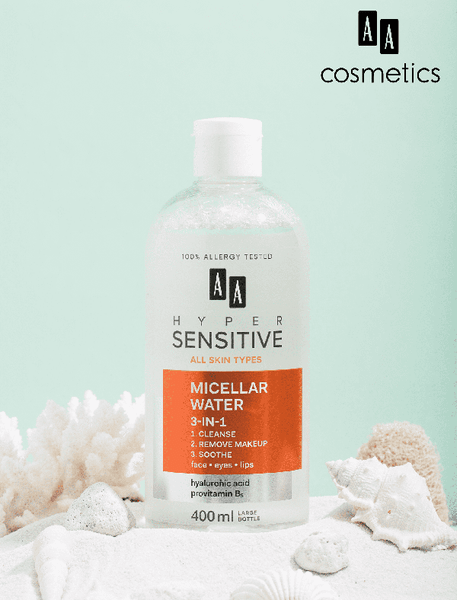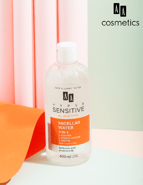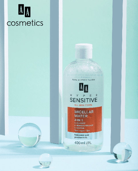 Nước tẩy trang AA Hyper Sensitive Micellar Water 3 in 1 là nước tẩy trang 3 trong 1 dùng được cho cả mặt, mắt và môi. Giúp làm sạch, cấp ẩm và làm dịu da. Nước tẩy trang AA Hyper Sensitive Micellar Water 3 in 1 được nghiên cứu bởi một trong bốn phòng Lab lớn nhất Châu Âu và sản xuất bởi nhà máy chuẩn GMP Dược Phẩm Châu Âu của AA Cosmetics.
